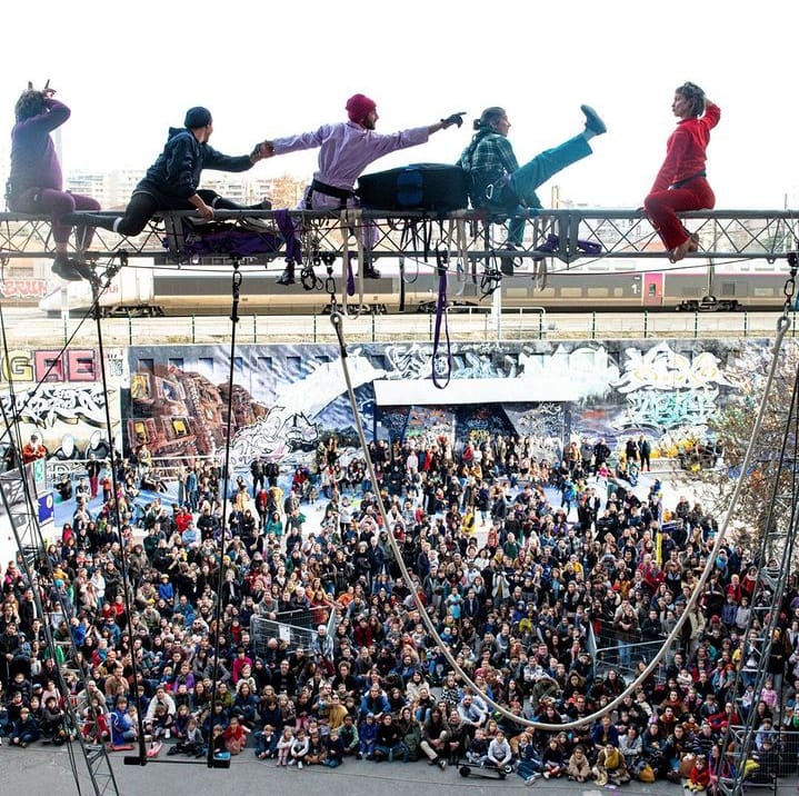 mouvement. Les corps des deux acrobates avancent en l’air, côte à
